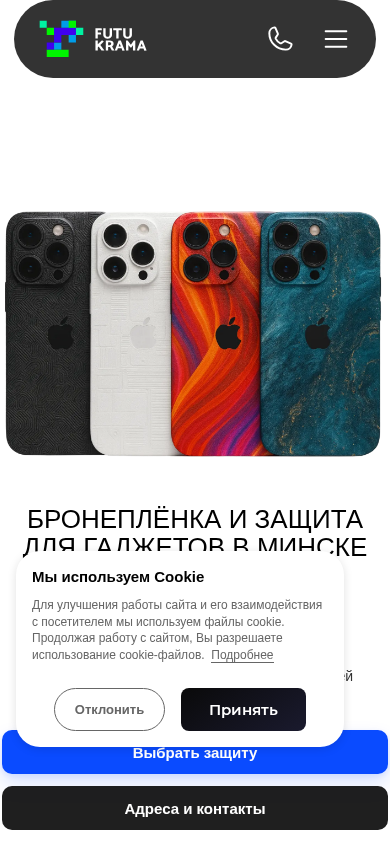 | SEO-описание | Защита гаджетов в Минске — бронеплёнка, винил, ламинация. FUTUKRAMA: печатаем и оклеиваем прямо на месте! Звоните по телефону: +375 (44) 531-00-75 |