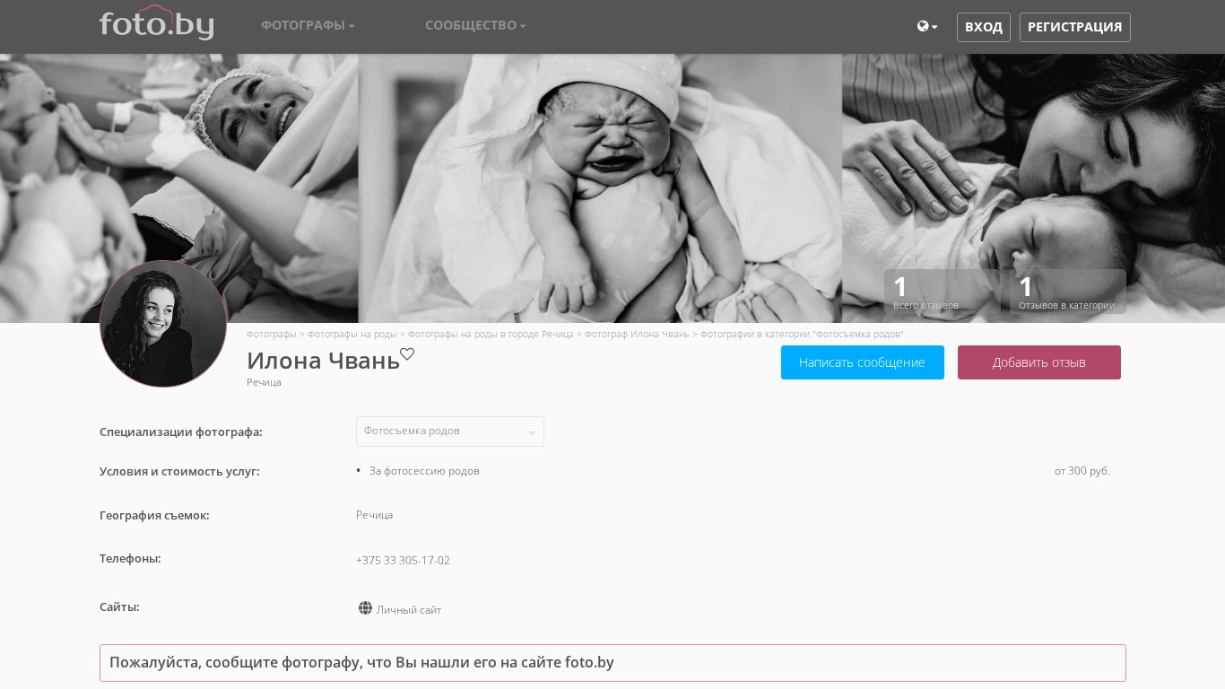 | SEO-описание | Фотографии в категории "Фотосъемка родов". Сайт фотографа Илона Чвань. Я работаю как фотограф на роды в городах Речица |