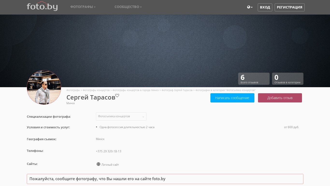 | AI-анализ | This online resource is the personal website of photographer Sergey Tarasov, based in Minsk, Belarus. The website primarily showcases his work in the "Фотосъемка концертов" (Concert Photography) category. Visitors can browse a collection of photographs taken at various events. The site does not have an explicit description or mission statement, but the presence of a catalog and community sections suggest that it may also offer services for booking photographers and connecting with other professionals in the field. The homepage features a list of popular photography categories and a search function. The website received 13 visits on August 13, 2025, and has six reviews in total, all in the "Фотографы > Фотографы концертов > Фотографы концертов в городе Минск > Фотогра |