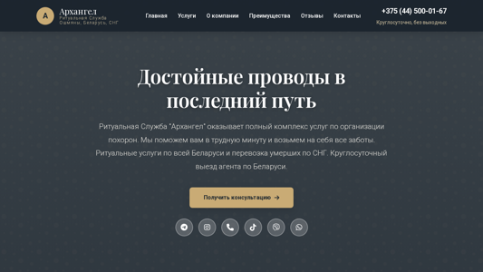 | AI-анализ | This online resource, titled "Ритуальная Служба 'Архангел' - достойные проводы в последний путь," offers comprehensive funeral services across Belarus and the CIS region. The company provides a full range of services, including funeral arrangements, document assistance, and transportation of the deceased. Operating 24/7, their agents are available throughout Belarus. Services include traditional funeral arrangements with consideration for religious and cultural traditions, cremation services, and memorial table organization. Their offerings also include assistance in selecting urns and organizing a farewell ceremony and burial site. Additionally, they offer transportation services for the deceased, including domestic and international transfers, and possess their own fleet of hearses. Their website showcases their work, emphasizing their commitment to respecting traditions and the deceased. |