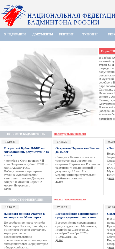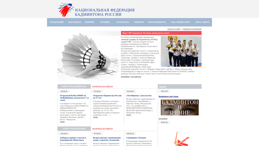 | AI-анализ | This website is the official website of the Russian Badminton Federation (Российская Федерация Бадминтона, НФБР). The site provides news, documents, rules, and information about the federation, its structure, and activities. It covers badminton competitions, including results, rankings, and classifications. The site also features information on international cooperation, education, and judging, as well as sections for mass sports, school sports, and veterans. The press center includes interviews and publications, and there is a search function to help users find specific content. The site reports on recent events, such as the Russian team winning all the gold medals at the III Games of the CIS countries, and ongoing tournaments in various categories. The site is available in Russian and offers a calendar of upcoming events and contacts for more information. |