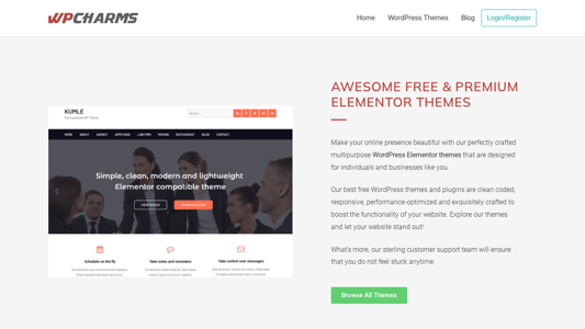 | AI-анализ | --- The website wpcharms.com offers a collection of WordPress themes, both free and premium. The themes are compatible with Gutenberg and Elementor, two popular WordPress plugins. The homepage showcases various themes with options to browse all themes, latest premium themes, and free themes. The website also provides information on specific themes such as Construction Kit Pro, Kotre Pro, Blog Kit Pro, Kumle Pro, and offers customer support and easy customization. Free themes are also available and optimized for performance and SEO. |