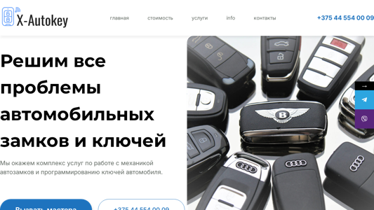 | AI-анализ | The web project "x-autokey.by" is a service offering comprehensive solutions for automotive lock issues and key programming for cars. The description highlights their ability to resolve all car lock and key problems, and provides contact information for customers to call and request services. The main services listed include key repair, removal and installation of locks, replacement of key bodies, and disabling alarm systems. The website also offers services for creating new car keys, including those with chips, and fabricating keys using CNC machines. Prices for various services are given, including a discounted rate for nighttime calls and a flat fee for master visits. The site boasts over 3,800 keys produced and 10 years of experience in the industry. |