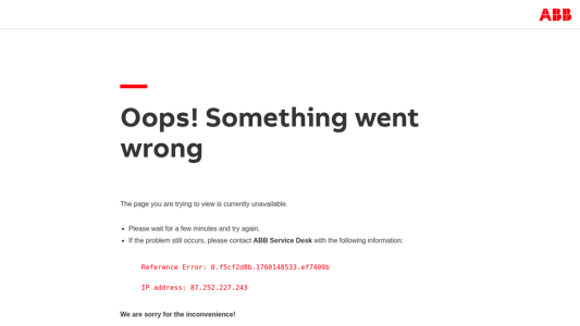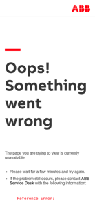 | AI-анализ | The web project "Site Error" is a webpage on new.abb.com that informs users when they encounter an error while trying to view a page on the site. The page includes a message that the page they are trying to access is currently unavailable and asks users to wait for a few minutes and try again. If the problem persists, users are instructed to contact the ABB Service Desk for assistance, providing the error reference number and their IP address. The page title is "Site Error" and the description is blank. The top keywords for this webpage are "error," "please," "for," "site," "you," "trying," "view," and "currently." The unparsed fragment includes instructions for users to contact the ABB Service Desk for assistance and provides an error reference number and IP address. |