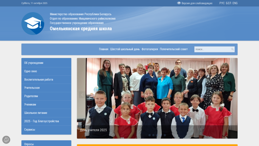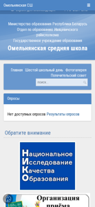 | AI-анализ | The web project "Омельнянская СШ" (Omelnianskaya SSH) is a Belarusian education institution website with a focus on a sixth school day event. The title translates to "Omelianka Middle School." The description includes mentions of the Ministry of Education, Ivacevich Regional Executive Committee, and the Sixth School Day. The website also features a photo gallery, popechatelskiy soviet (school council), and contact information. The school's mission, goals, history, notable achievements, and admission information are also included. The site appears to be run by the Ivacevich Regional Executive Committee and is part of the Belarusian state education system. |