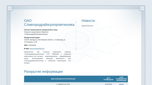 | AI-анализ | This online resource is the informational website of Open Joint Stock Company "Slavgorodraiopromtekhnika" (UNP 700030493), located in Slavgorod, Belarus. The site provides access to various reports and documents, including annual reports from 2000 to 2024, and information about the formation of the shareholders register. The site also offers a login area for users to access a personal cabinet. |