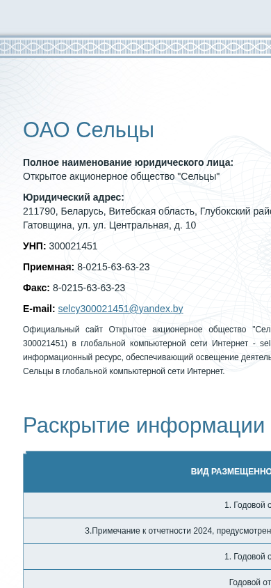 | AI-анализ | The website is an informational resource for Open Stock Company "Selcy" (UNP 300021451), providing coverage of its activities in the global computer network Internet. The website offers downloadable annual reports from 2017 to 2024, including a note on reporting requirements in 2024 and 2025. The website also features a registration form for accessing a personal cabinet, requiring an email address and password. |