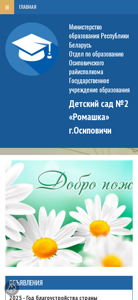 | AI-анализ | This website is for the Kindergarten No. 2 'Romaшка' in Osiповичи, Belarus. The title of the site reflects its name and location. The description includes information about the licensing and contacts, as well as the structure and functions of the kindergarten. The top keywords suggest that the site offers news, details about the kindergarten's educational program and admission, and information about safety and security. The site also appears to have a section for consultations with specialists and administrative procedures. The domain is a government education website, as indicated by the .gov.by extension. |
