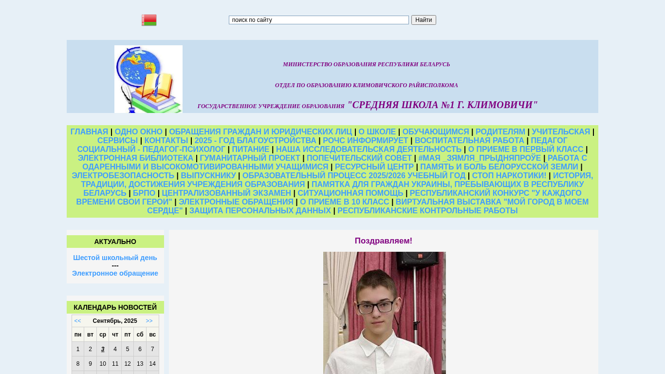 | AI-анализ | This online resource is the official website of the Middle School No. 1 in Klimovichi, Belarus, under the Ministry of Education of the Republic of Belarus, Klimovich District Executive Committee, and the State Educational Institution "Middle School No. 1 in Klimovichi." The site provides information about the school, its educational process, services, contacts, and various initiatives. Keywords related to the year 2025, detailed information, news, cabinet, director, floor, Belarus, deputy, phone numbers, youth, education, citizens, portal, work, council, special, fund, president, support, pedagogue, social, food, research, admission to first grade, electronic library, humanitarian project, parents, teacher, services, memory, and electricity are frequently used. The site includes sections on school history, traditions, achievements, student admissions, |