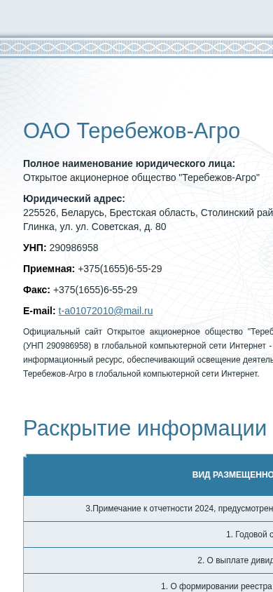 | AI-анализ | This online resource, ta.epfr.by, is the informational website for Open Joint Stock Company "Terebezhov-Agro" (UNP 290986958) located in Belarus, Brest Oblast, Stolinsky District, village of Glinka, Sovetskaya Street, house 80. The site provides information on the company's activities in the global computer network Internet. It offers downloadable documents such as annual reports for the years 2022, 2023, and 2024, auditor's reports, information on the formation of shareholder registers, and details on dividend payments. Additionally, the site includes notices of general shareholder meetings and information on the issuance of additional shares. The site can be contacted through the phone number +375(165 |