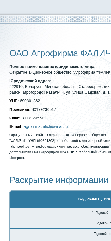 | AI-анализ | This online resource is the official website of Open Joint Stock Company (OJSC) "Agrifirm Falichi" (UNP 690301862). It provides information about the company's activities in the global computer network Internet. The website offers downloadable annual reports and auditor's conclussions for the years 2024, 2023, 2022, 2021, 2020, 2019, and 2018. The company is located in Belarus, Minskaia Voblast, Starodorozhskiy Region, agro-town Kavalichi, ul. Sadovaya, 1. The contact information includes a phone number, fax number, and email address. |