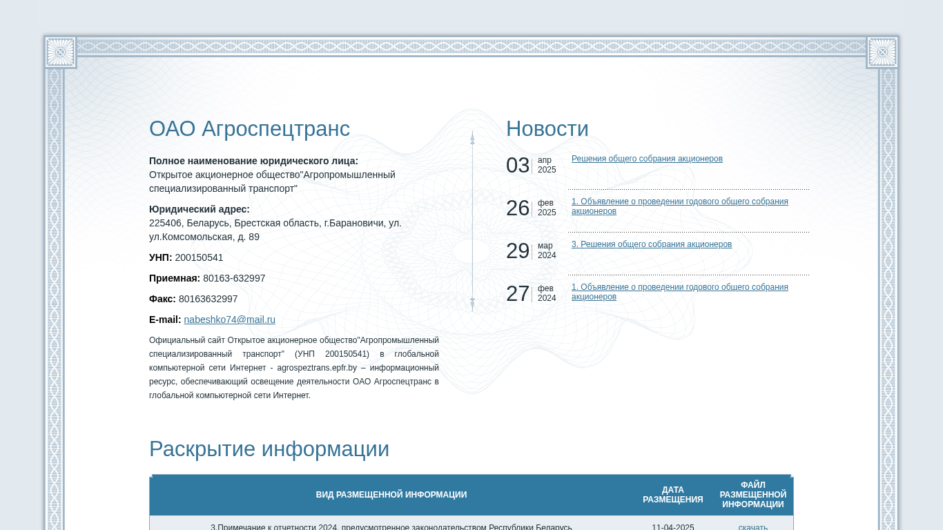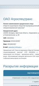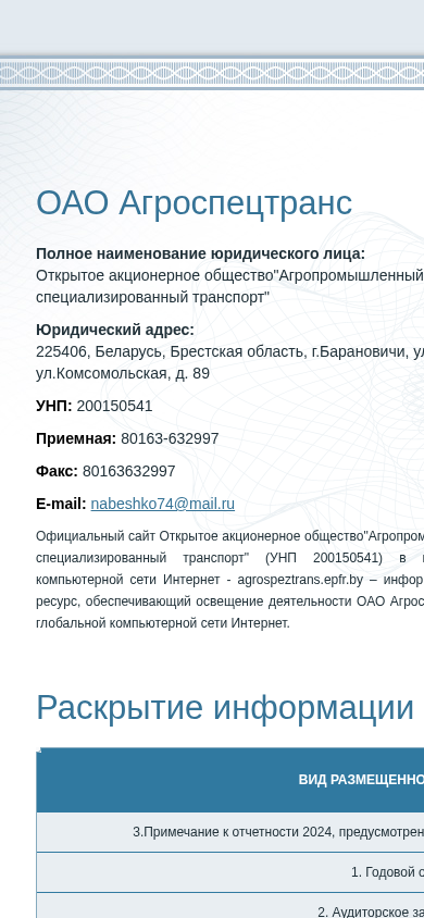 | AI-анализ | The web project "Агроспецтранс ОАО" (Open Joint Stock Company "Agroindustrial Special Transport") is an informational resource providing coverage of the activities of the company in the global computer network Internet. The site includes announcements of general shareholder meetings, annual reports, auditor's reports, and the formation of the shareholder register. The domain agrospeztrans.epfr.by was last accessed on April 11, 2025. The site contains downloadable files for the annual report of 2024, auditor's report of 2024, and the formation of the shareholder register as of February 25, 2025. Similarly, there are downloadable files for the annual report of 2023, auditor's report of 2023, and the formation of the share |