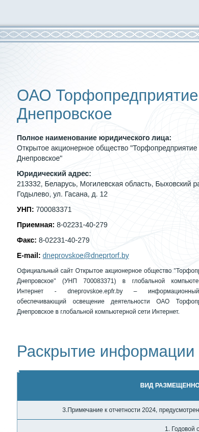 | AI-анализ | The web project <Торфопредприятие Днепровское ОАО> is a corporate website for Open Joint Stock Company "Torfopredpriatie Dneprowske" (Company Registration Number 700083371) located in Belarus, Bypovsky District, village of Godylevo, ul. Gasan, d. 12. The website provides information about the company's activities and offers downloadable annual reports, auditor reports, and other documents required by Belarusian legislation. The website is developed by epfr.by and includes a personal cabinet feature with email and password access. |