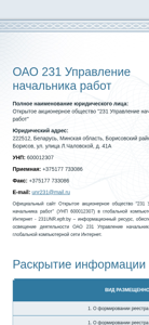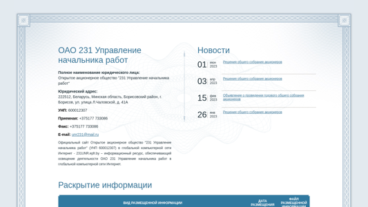 | AI-анализ | This website is the official online presence of Open Joint Stock Company "231 Management of Labor" (OJSC 231 Management of Labor), located in Borisov, Belarus. The site provides information about the company's activities in the global computer network Internet, including news, resolutions of shareholder meetings, and various announcements. Users can download reports, such as the annual report, auditor's conclusion, and register of shareholders. The site also offers information on significant transactions and restructuring or liquidation of the company and its subsidiaries. The domain is 231unr.epfr.by. |