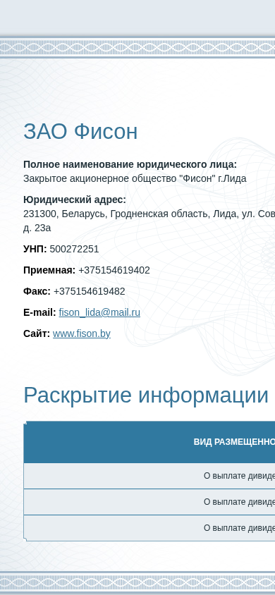 | AI-анализ | This website, titled "Фисон ЗАО," is a business website for the closed joint-stock company "Фисон" based in Лида, Гродненская область, Belarus. The company's full legal name is "Закрытое акционерное общество 'Фисон'" and its registered address is ул. Советская, д. 23а, 231300, Belarus. The website provides information on dividend payments, with files available for download from 19-01-2023, 26-09-2022, and 05-10-2018. The site also includes a link to register and log into a personal cabinet using an email address and password. The website was developed by epfr.by. No news section is present on the site |