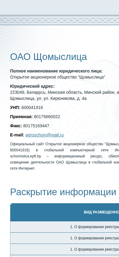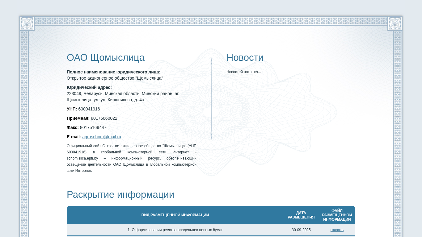 --- The website schomislica.epfr.by is the informational resource for Open Joint Stock Company "Щомыслица" (UNP 600041916) in the global computer network Internet. It provides coverage of the company's activities and offers various documents for download, including annual reports, dividend payment information, and registry of shareholders. The website features files for the formation of shareholder registries on multiple dates, such as September 30, 2025, July 1, 2025, April 8, 2025, March 25, 2025, February 3, 2025, September 25, 2024, July 2, 2024, April 19, 2024, March 29,