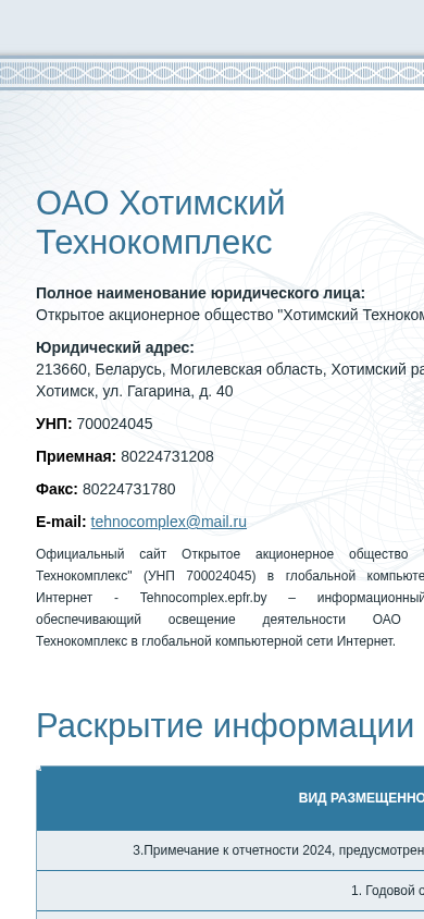 | AI-анализ | The portal Tehnocomplex.epfr.by is the official website of Open Joint Stock Company (OAO) "Hotimsky Technocomplex" in the global computer network Internet. It provides information on the activities of the company and offers downloadable annual reports from 2017 to 2024. The website includes a personal cabinet for registered users, accessible with an email address and password. The company's full legal name is "Open Stock Company 'Hotimsky Technocomplex'" and its legal address is in Belarus, Mogilev Oblast, Hotimsky District, Hotimsk town, ul. Gagarina, d. 40. The contact information includes a phone number, fax number, and email address. The website is developed by epfr.by. |
