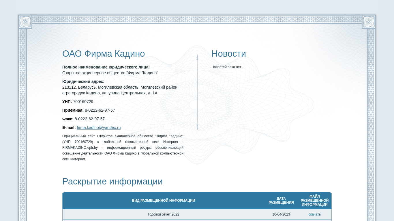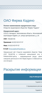 | AI-анализ | This online resource, FIRMAKADINO.EPFR.BY, is the informational website for Open Joint Stock Company "Firm Kaдиno" (UNP 700160729), located in Belarus. The site provides access to various reports and documents, including annual reports and information on the formation of shareholder registries for the years 2017 to 2022. Users can access these files by clicking on the provided links and entering their email address and password to log into their personal account. The site is developed by epfr.by. |