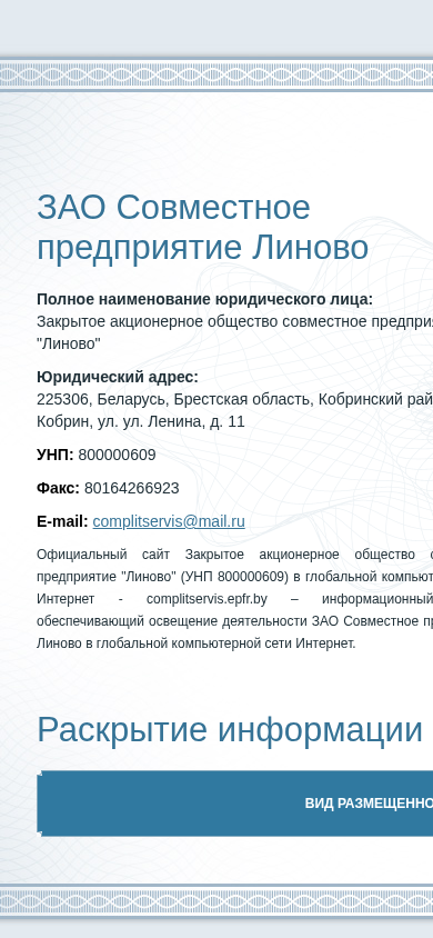| SEO-лексика | совместное предприятие линово зао пароль e-mail информации закрытое акционерное общество адрес унп 800000609 complitservis глобальной компьютерной сети интернет epfr размещенной |