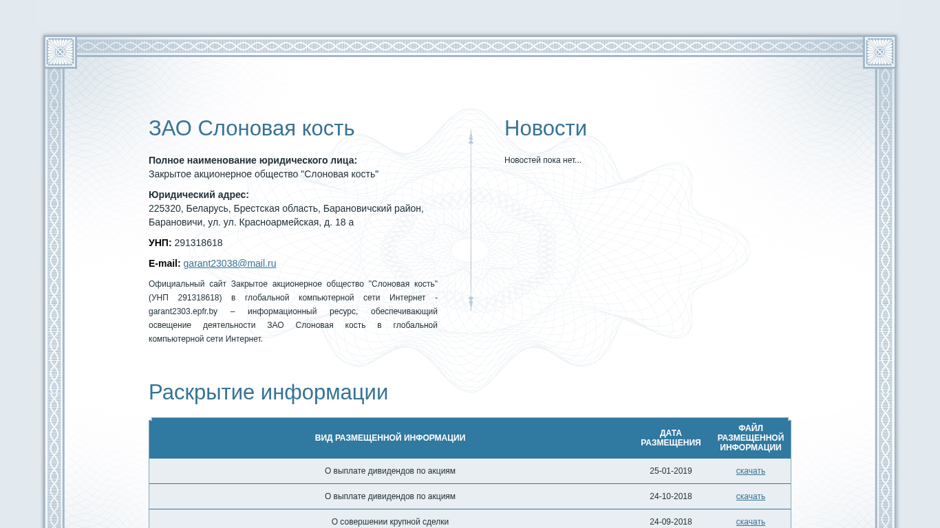 | AI-анализ | The portal "Garant2303.epfr.by" is an informational resource for the closed joint-stock company "Sloanovaia Kost'." Based in Belarus, the company's legal address is listed as Krasnoarmeiskaya Ulitsa 18a in Baranovichi, Baranovichi District, Brest Oblast. The website provides information on the company's activities in the global computer network Internet, including news and downloadable files related to dividend payments, significant transactions, and other updates. Users can access a personal cabinet by providing an email address and password. The website is developed by epfr.by. |