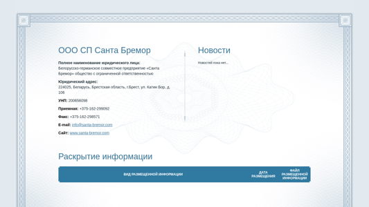 | AI-анализ | The web project "СП Санта Бремор ООО" is a Belarusian limited liability company named "Santa Bremor" with a German partner, registered at the address 224025, Belarus, Brest Region, Brest, ul. Katyn Bor, d. 106. The company's contact details include a phone number (+375-162-299092), a fax number (+375-162-298571), and an email address (info@santa-bremor.com). The website, located at santa-bremor.epfr.by, is developed by epfr.by and currently does not have any news available. Users can access a personal cabinet by providing an email address and password. The keywords associated with the project are "па |