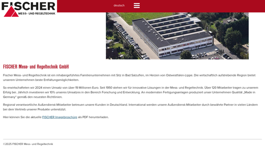 | SEO-описание | FISCHER Mess- und Regeltechnik GmbH ist ein inhabergeführtes Familienunternehmen und gehört europaweit zu den führenden Herstellern innovativer Produkte und kundenspezifischer Anwendungslösungen für viele Industriebereiche, z.B. Messung von Druck, Differenzdruck, Temperatur, Durchfluss sowie Füllstand. |