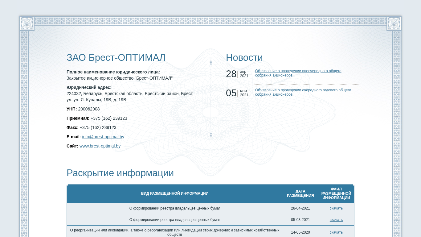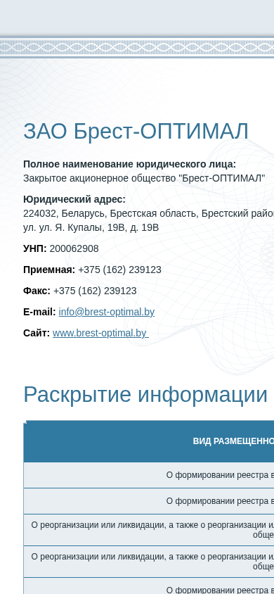 | AI-анализ | The website <Брест-ОПТИМАЛ ЗАО> is a business website for a closed joint-stock company named "Брест-ОПТИМАЛ" located in Belarus. The company's full legal name and address are provided, along with its Unified State Register number (200062908) and contact information including phone, fax, and email. The site includes news sections with announcements for shareholder meetings and the publication of shareholder registers from April 2019 to April 2021. Additionally, there are files for information regarding reorganization or liquidation of the company and its subsidiaries, as well as shareholder registers from 2012 to 2018. The website is developed by epfr.by and includes a login panel for a personal cabinet with email and password access |