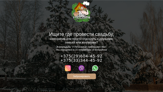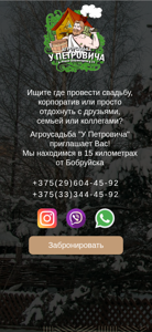 | Название / Заголовок | Агроусадьба "У Петровича" | Лучшая агроусадьба в Бобруйске и Бобруйском районе | Русская баня, бассейн, банкетный зал, беседки, собственное озеро |