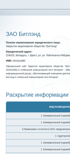 | AI-анализ | This online resource, titled "Битлэнд ЗАО" (Bitlend ZAO), is the official website of Closed Joint Stock Company "Bitlend" (UNP 291541890) located in Belarus, Brest, ul. Leytenant Riabtsev, d. 108/1. The website provides access to various reports and documents related to the company's activity in the global computer network Internet. These include annual and quarterly reports, audit reports, and other financial information. Some of the specific documents available for download are: an annual report from July 28, 2025, a quarterly report from May 2, 2025, a note to the 2024 financial reporting, an auditor's report from April 23, 2025, |