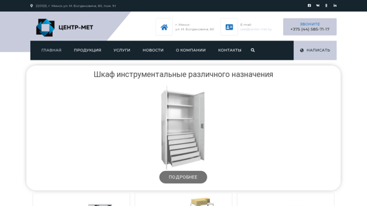 | SEO-описание | Предлагаем шкафы, стеллажи, сейфы, верстаки, промышленную мебель производства компании ЦЕНТР-МЕТ. ✅ Отгрузка со склада в Минске или Молодечно. Возможна доставка. Звоните: ☎️ +375 (44) 585-7117 |