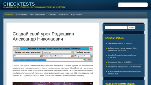 | AI-анализ | The web project "Create Your Lesson by Rodushkin Alexander Nicolievich" offers a set of computer programs called CheckTests to help teachers create and edit their electronic educational materials (ESO) using their personal computers. The software allows teachers to create and modify the content and plan of their lessons, exchange their work through export/import, and automate the educational process from launching programs to creating archives of students' academic activities. The platform also includes features for maintaining an electronic journal, providing materials for physical education, and reflecting. Teachers can create and edit plans for classroom instruction, self-study materials, homework assignments, and more. The project supports materials from other authors through open internet sources and a Web 2.0 network. Additionally, "Orion" is an electronic learning platform focusing on the subjects of "Informatics" and "Astronomy" along with the provided software package. |