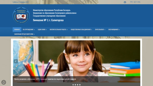 | AI-анализ | The website is the official site for Soligorsk City's First Gymnasium, run by the Ministry of Education of the Republic of Belarus. It provides information on the school's structure, schedule, and services. The gymnasium offers profile-based education with a focus on engineering and technology. The site includes sections on news, interactive map, photo gallery, and video library from various academic years. It also features administrative procedures, electronic application, and contacts. The school offers various programs such as social-psychological services, volunteer movement, and health camps for students. The site contains sections for organizational documents, anti-corruption measures, and accessibility services for disabled individuals. The gymnasium operates under a set schedule and accepts applications from citizens during specific periods. The site includes various downloadable forms and guidelines for administrative procedures. It also offers a virtual methodological cabinet and teacher resources. The school's |