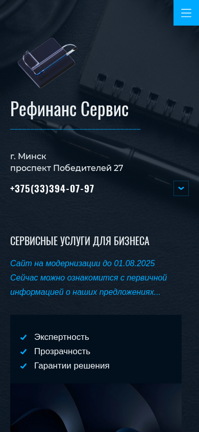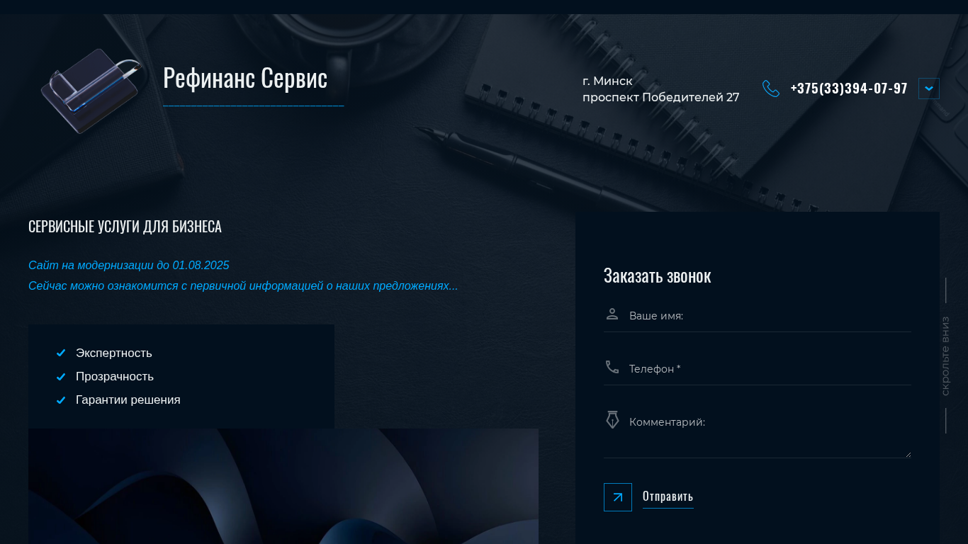 | AI-анализ | The portal Refinans Servis is a financial service based in Minsk, Belarus. It offers various business and individual financing solutions, including project financing, trade financing, and refinancing of loans and leasing contracts. The website includes consultancy services and provides information on the expertise, transparency, and guarantees of its offerings. Users can request a callback by filling out a form with their name and phone number. The site is undergoing modernization until August 1, 2025. The services listed include financial solutions for business operations, solutions for increasing revenue, and various financing alternatives. Additionally, the portal offers outsourcing services for VED (Value Added Tax), legal and accounting services, and assistance with opening new business ventures. |