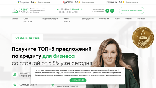 | AI-анализ | --- This online resource is a business credit service with an interest rate starting at 7%. It offers loans with a term of up to 7 years and a maximum of €12.5 million without collateral, guarantors, or initial deposit. The service caters to both primary capital and working capital. The application process is quick and simple. Key services include credit assistance for businesses and an online loan application. Users can ask questions via a messenger and receive a consultation at +375 (44) 555-4-222, Monday to Friday from 10:00 to 19:00. The website has a rating of 5.0 based on reviews. The company specializes in helping clients get a loan and provides a free credit history analysis and instruction on "How to get financing even during a crisis." The platform works with banks, funds, investors, and |