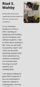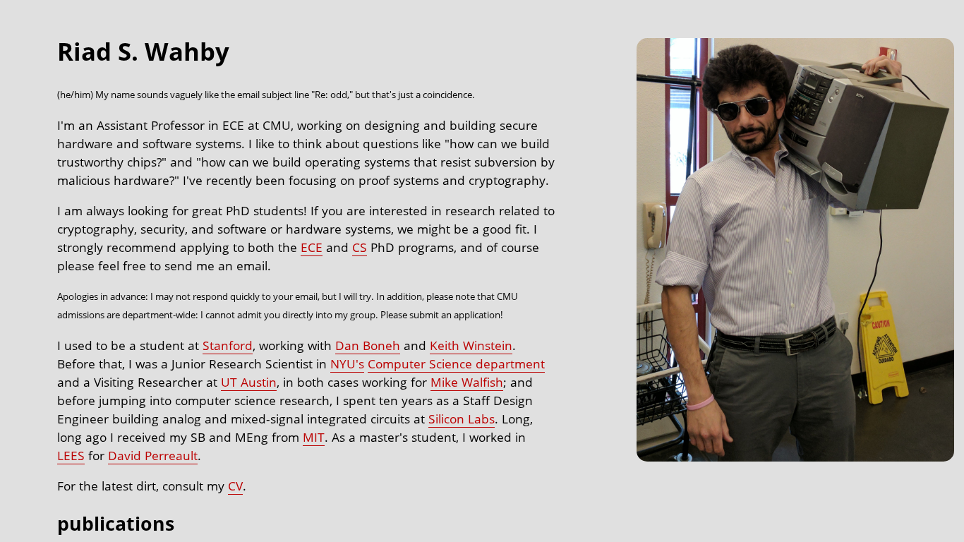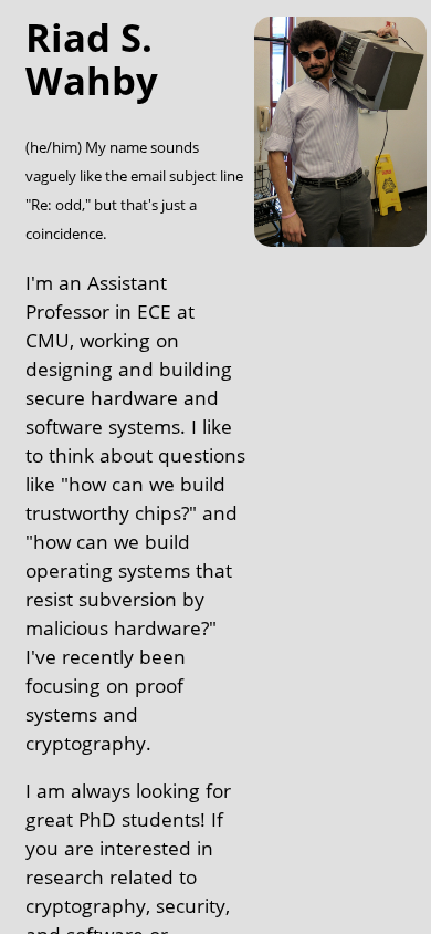 | AI-анализ | The portal <Riad S. Wahby> is a personal website belonging to Riad S. Wahby, an Assistant Professor in the Electrical and Computer Engineering (ECE) department at Carnegie Mellon University (CMU). The site provides information about his research interests, which include designing and building secure hardware and software systems, proof systems, and cryptography. Wahby's research focus is on questions related to building trustworthy chips and operating systems that resist subversion by malicious hardware. He is currently looking for PhD students interested in research related to cryptography, security, and software or hardware systems. Wahby's CV is available on the site for those interested in his background and publications. He has previously worked at Stanford, NYU, and UT Austin, and received his SB and MEng from MIT. The site includes information about his past research projects, such as COBBL |