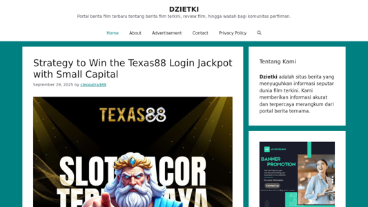| AI-анализ | The website "DZIETKI" is a film news portal, providing the latest film news, reviews, and a platform for the film community. The homepage includes a menu with sections for Home, About, Advertisement, Contact, Privacy Policy, and Strategy to Win the Texas88 Jackpot with Small Capital. The portal's content is primarily focused on film, with articles discussing ways to maximize winnings on the Texas88 gambling platform. Despite the title's focus on film, the content includes an article on Texas88 and its jackpot strategies. The website's keywords reflect its film and gambling content, with terms such as "film," "review," "Texas88," "jackpot," and "gambling" being frequently used. The top words in the fragment include "the," "and," "your," "you," "Texas88," "for |