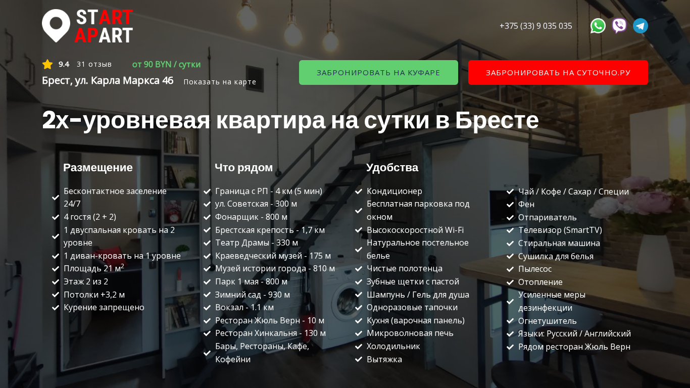 | SEO-описание | ⭐⭐⭐⭐⭐ Start Apart ☎️ +375 (33) 9-035-035 ✅ Ищете, где снять квартиру на сутки в Бресте? Старт Апарт – Двухуровневая квартира в аренду посуточно в историческом Центре Бреста! |