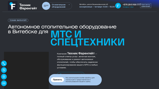 | AI-анализ | --- This online resource, titled "Автономное отопительное оборудование в Витебске | Техник Фаренгейт," is a website dedicated to providing heating equipment solutions in Vitsebsk, Belarus. The company, Technik Farengeyt, offers services including installation, maintenance, and repair of autonomous heating systems for MTS (Mobile Telecommunication Systems) and special machinery. They also sell heating equipment and spare parts. The website includes a catalog of their offerings and contact information, with operating hours on weekends from 9:00 to 18:00 and a phone number +375 29 5 100 777. The website also features a video player and an option to download an MP4 file. The company specializes in high-quality services related to the sale and maintenance of |