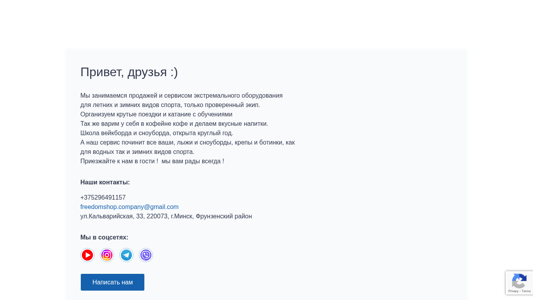 | AI-анализ | This online resource is a shop and school for extreme sports equipment, offering proven gear for both summer and winter activities. They organize exciting trips and lessons, and also serve coffee and make delicious beverages in their coffee shop. The vakeboarding and snowboarding school is open year-round. Their service can repair all types of skis, snowboards, bindings, and boots for both water and snow sports. Welcome guests anytime! We are always happy to see you! Contact information is provided, including a phone number, email address, and physical location in Minsk, Belarus. Social media links are also included. The website is owned by the Limited Liability Company "Freedom Company." |