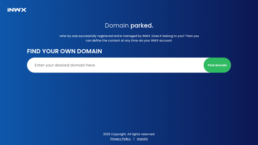 | AI-анализ | This website, refer.by, is a parked domain managed by INWX. The title of the website is "refer.by" and the description is blank. The top words associated with the domain are "domain," "refer," "inwx," "you," "your," "find," "parked," "was," "successfully," "registered," "and," "managed," "does," "belong," "then," "can," "define," "the," "content," "any," with frequencies ranging from 1 to 3. The website is copyrighted and a privacy policy and imprint are provided. |