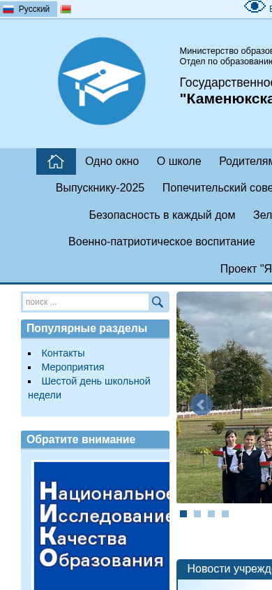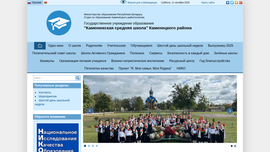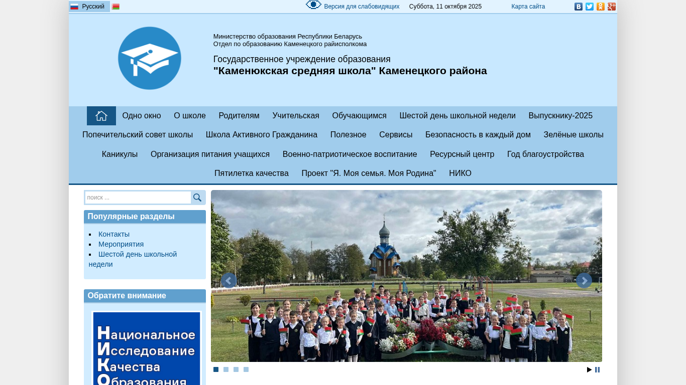 | AI-анализ | --- The web project "Каменюкская СШ" (Kamenyuskaia SS) is a website for the state educational institution "Каменюкская средняя школа" (Kamenyuskaia Srednya Shkola) in the Каменецкого район (Kamenetsokyi rayon) of Беларусь (Belarus). The site primarily focuses on information related to the school, its faculty, students, and various educational and extracurricular activities. Topics include the sixth day of school, news, events, and resources for parents, teachers, and students. Keywords include "school," "education," "Belarus," "regions," and "districts." The website contains sections on academic achievements, health and safety, green schools, canteens, military-patriotic education, and a resource center. Popular |