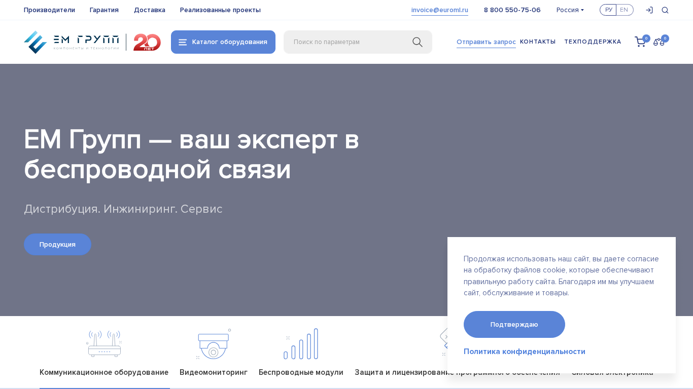 | SEO-описание | Компания ЕМ Групп (ЕвроМобайл) - инжиниринг и поставки беспроводного оборудования и решений на базе LTE, 3G, GSM, NB-IoT, LoRa для транспорта, ИТС, умного города, ЖКХ, энергетики, безопасности, интернета вещей. |