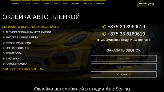SEO-описание | Студия Autostyling с 2009 года оказывает услуги по оклейке автомобилей защитными антигравийными пленками, тюнингу кузова автовинилом и брендированию. |
