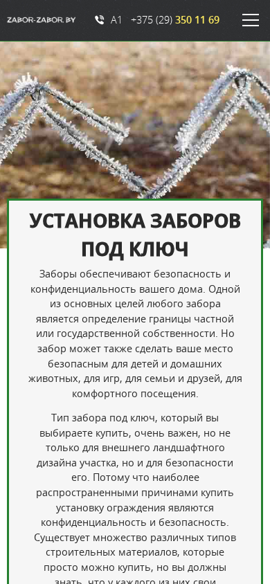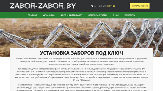 | SEO-описание | Забор под ключ купить установку дешево в Минске и Минской области. Качественное производство и монтаж любых типов ограждений, калиток и ворот с гарантией и оплатой после завершения работ. |