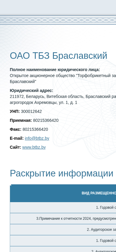 | AI-анализ | This website belongs to Open Joint Stock Company "Torfbryketny Zavod Braslavsky" (Braslavsky Peat Brick Factory OJSC). The company's full legal name and registration address are provided: Open Joint Stock Company "Torfbryketny Zavod Braslavsky", 211972, Belarus, Vitsebskaya oblast, Braslavskiy rayon, agrogorodok Ahramovcy, ul. 1, d. 1. The website contains various financial reports and audit conclusions from 2010 to 2025, including annual reports for the years 2024, 2023, 2022, 2021, 2020, and 2019. These reports and conclusions can be downloaded from the website |