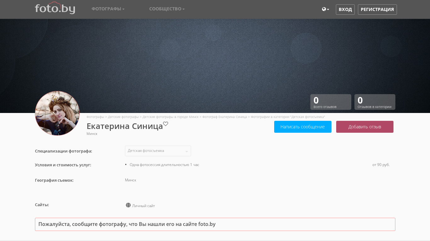 | SEO-описание | Фотографии в категории "Детская фотосъемка". Фотограф Екатерина Синица - выполняю следующие виды фотосъемок: love story, детская фотосъемка, фотосъемка животных. Работаю в городах: Минск |