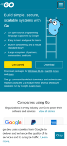 | AI-анализ | The web project "The Go Programming Language" is an open source initiative for building secure, scalable systems using the Go programming language. The project's website provides resources and documentation for learning, using, and building software with Go. It includes sections on case studies, use cases, security, documentation, and community engagement. The site's design is simple and straightforward, with clear navigation and a focus on practical information. The project's official blog is also accessible from the website, offering insights and updates from the Go community. The Go language is supported by Google and has a large ecosystem of partners, communities, and tools to facilitate development and deployment. Users can download the Go language and access its standard library, as well as download packages for various operating systems. The site is hosted on the golang.org domain. |