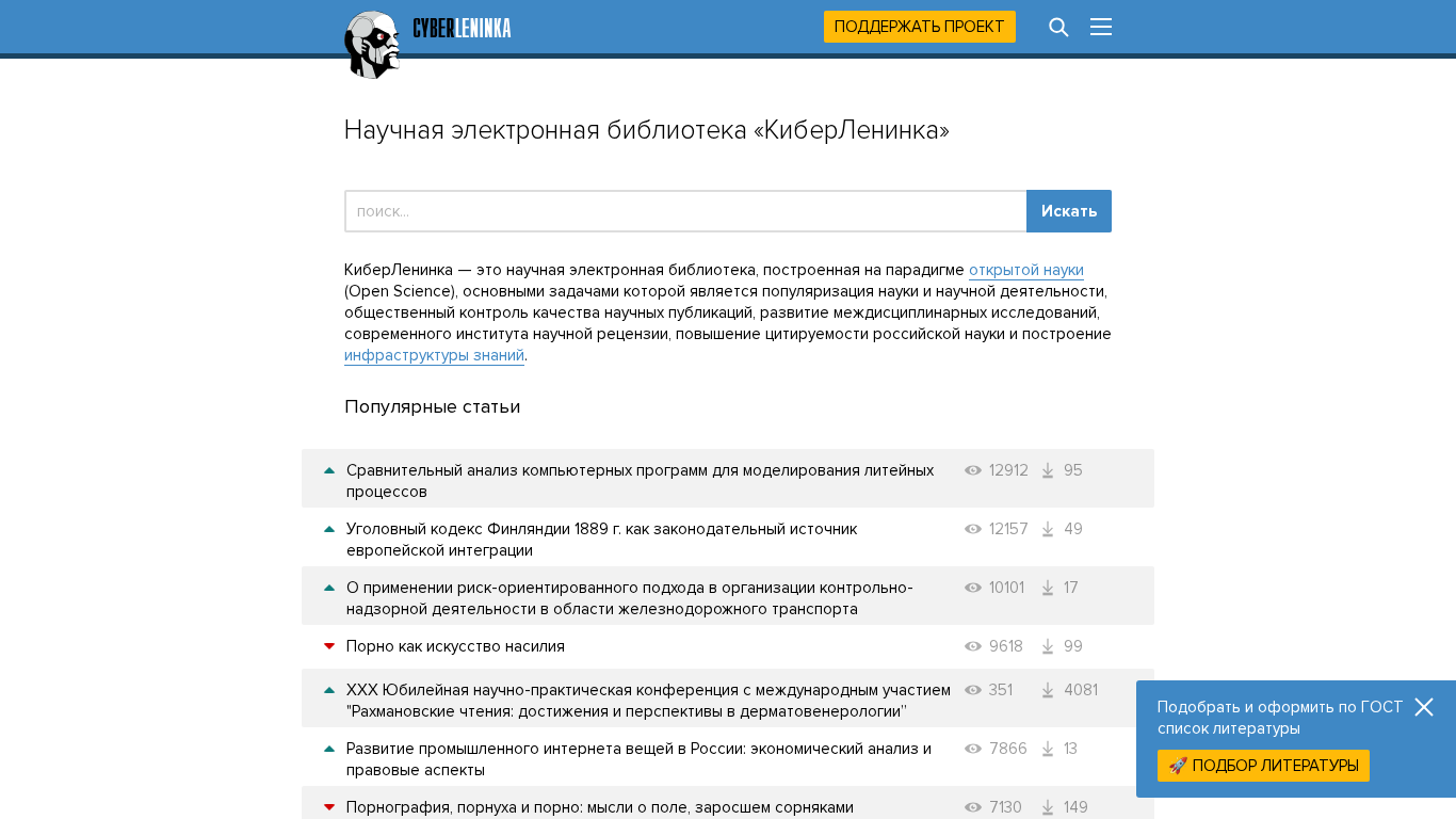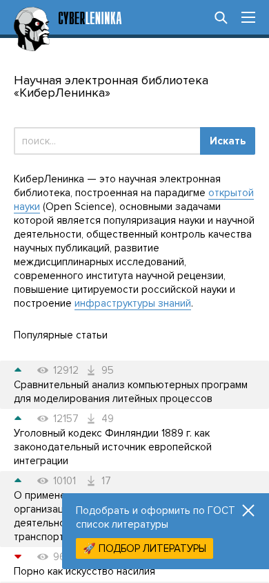 | AI-анализ | This website is the CyberLeninka electronic library, which provides the opportunity to read scientific articles for free. It invites scientific journals and publishers to collaborate on publishing research works in open access (Open Access) and promoting open science (Open Science) in Russia. The Scientific Electronic Library 'CyberLeninka' supports the paradigm of open science, with key objectives including popularizing science and scientific activity, ensuring public control of scientific publication quality, fostering interdisciplinary research, developing a modern scientific review institution, increasing the citation of Russian science, and building a knowledge infrastructure. Popular articles include 'A Comparative Analysis of Computer Programs for Modeling Foundry Processes' and 'The Criminal Code of Finland of 1889 as a Legal Source of European Integration'. The library also features academic journals such as 'Problems of Modern Education', published by the |