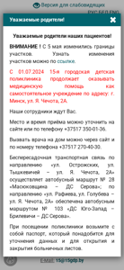 | AI-анализ | The portal 15-я городская детская поликлиника is a healthcare website dedicated to a children's clinic located in Minsk, Belarus. The address is on Yan Chechot Street, 2A. The clinic provides various services including registration, doctor consultation, emergency psychological assistance for children and adults, and a hotline. The contact numbers for different services are listed, such as the multichannel registration number, a home doctor consultation number, and emergency psychological assistance numbers. The clinic operates Monday through Saturday, with extended hours on Saturdays. There is also a section for news, articles, and information on various health-related topics. The website includes a chatbot from the Ministry of Health and information on changes to the national vaccination calendar from 2025. The site offers forms for patients to fill out and an ideological work section. Some services appear to be fee-based |