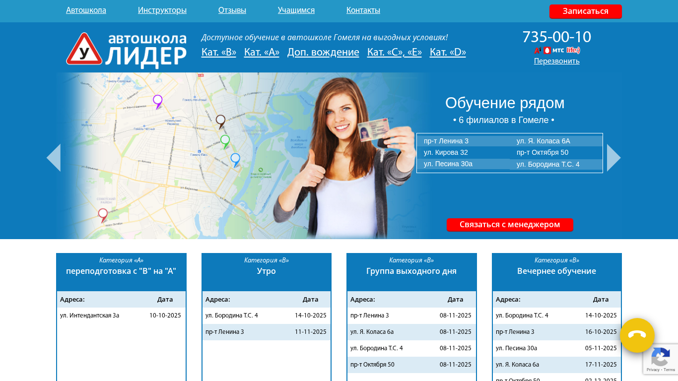 | SEO-описание | Официальный сайт автошколы Лидер. Курсы вождения в Гомеле категории "В" и "А" по доступной цене. Рассрочка 0%. Записывайтесь онлайн, идёт набор групп! |